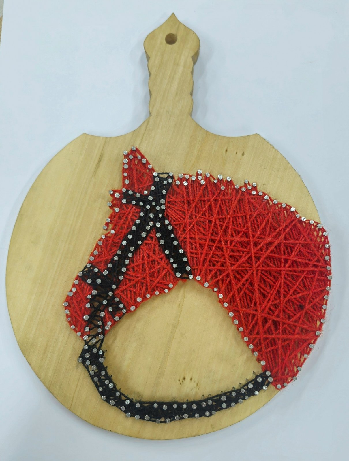 Наша работа еще не завершена, она в процессе, но уже есть контуры лошадей, собранный из десятков гвоздиков, натянута алая нить, которая и рисует нам статного коня