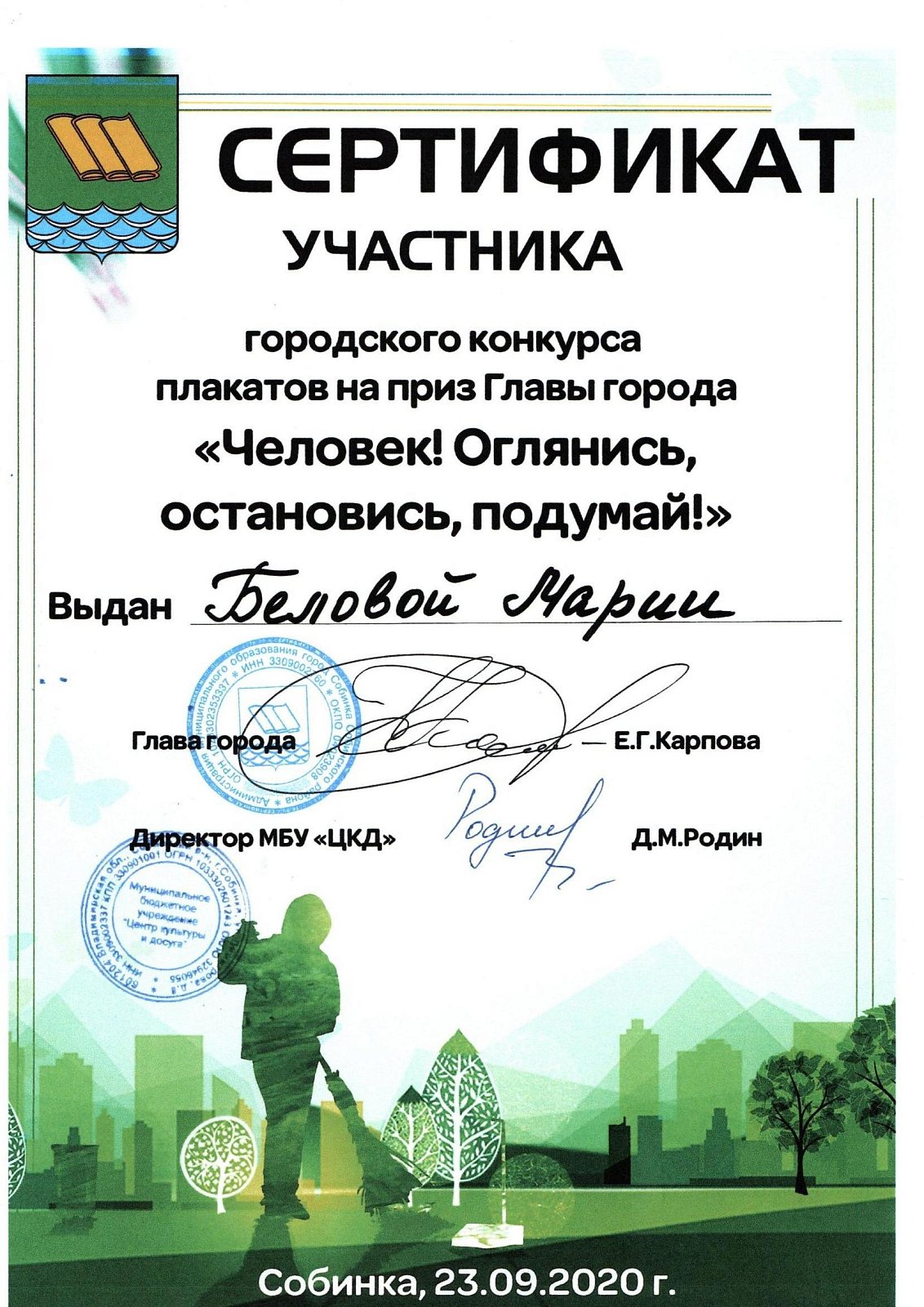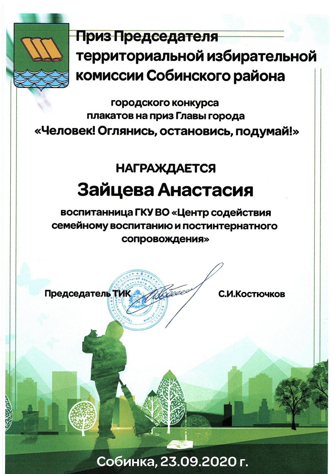 Конкурс плакатов на приз главы города под названием «Человек ! Оглянись, остановись, подумай !» в Собинке был объявлен в первый осенний месяц. Нашим ребятам не занимать активности по участию в таких мероприятиях. Их интересует практически все. А здесь и тема еще очень интересная! К выполнению работ они отнеслись очень ответственно. Воспитатели Сухорукова С.С. и Крылова-Пешкова Н.Е. умело направили творчество юных художников в нужное русло. Работы детей были справедливо оценены жюри конкурса. Награждение ребят прошло 23 сентября. Настя З. получила Приз Председателя территориальной избирательной комиссии Собинского района и ценный подарок ! А Мария Б. - сертификат ! Девочки очень рады победе, воспитатели горды за своих подопечных .