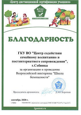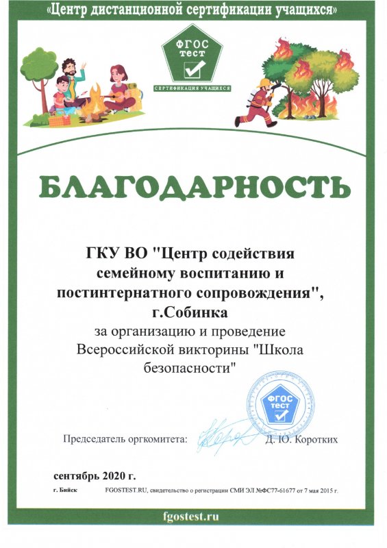 Центр дистанционной сертификации учащихся «ФГОСТЕСТ» провел в сентябре Всероссийскую викторину «Школа безопасности» для учащихся 1-11 классов в которой приняли участие воспитанники нашего центра. Из 18 детей, 5- заняли призовые места (I место-один, II место-один, III место - три ) по России.