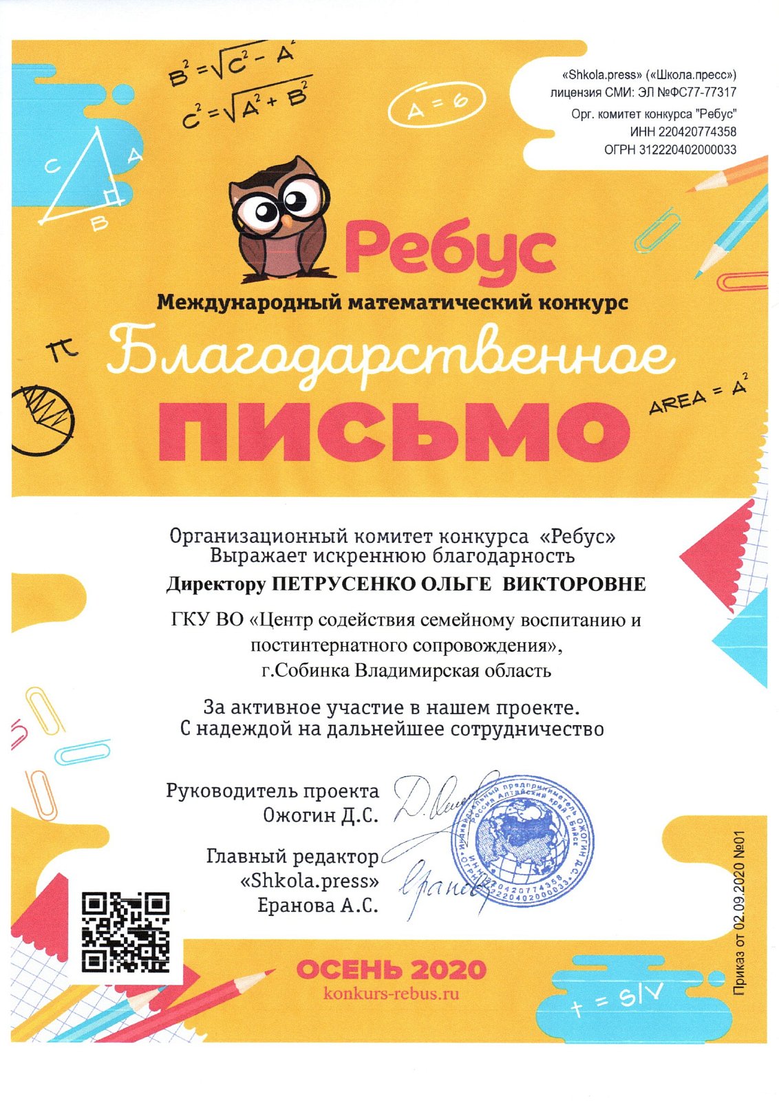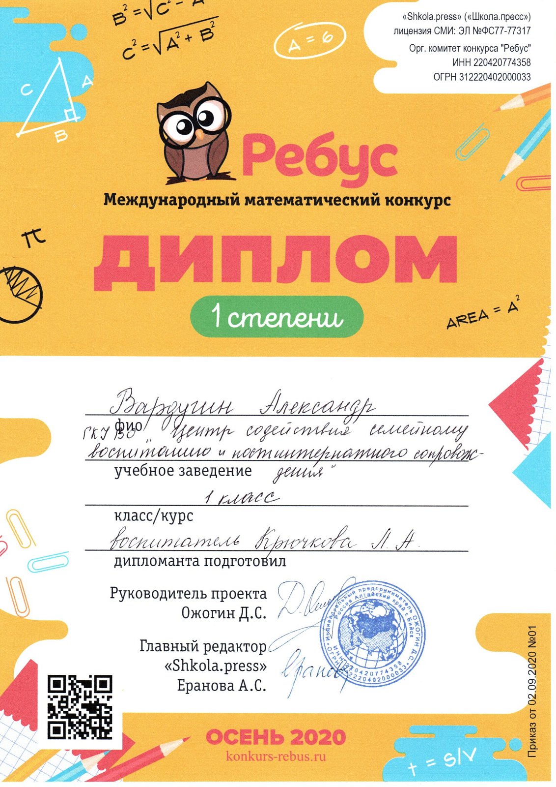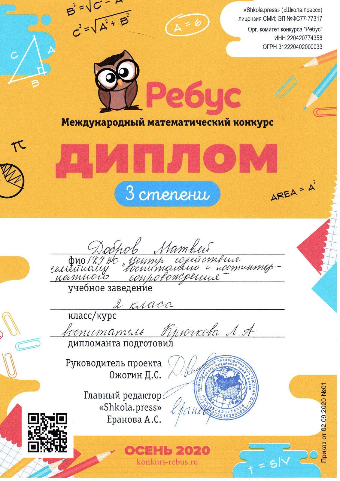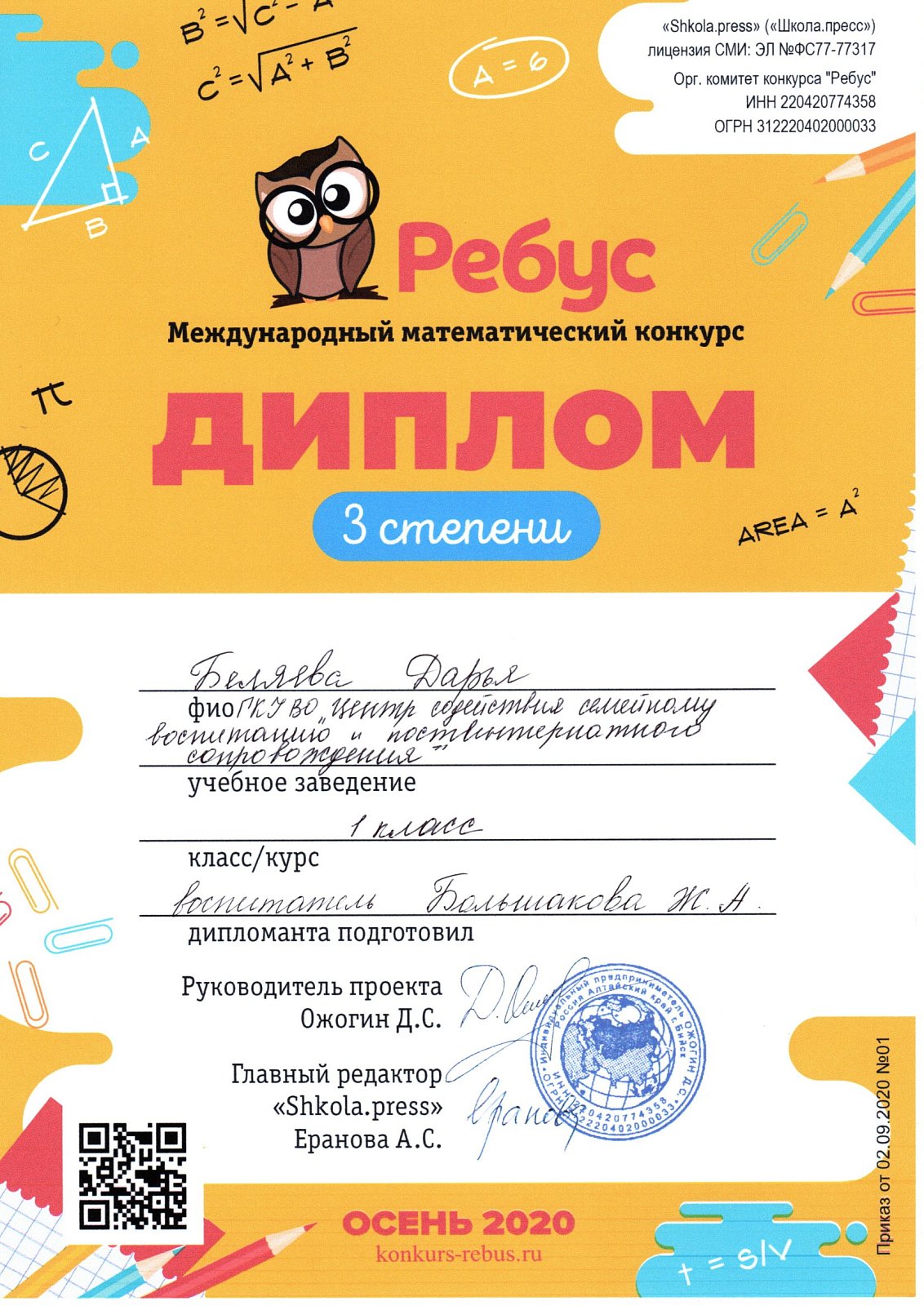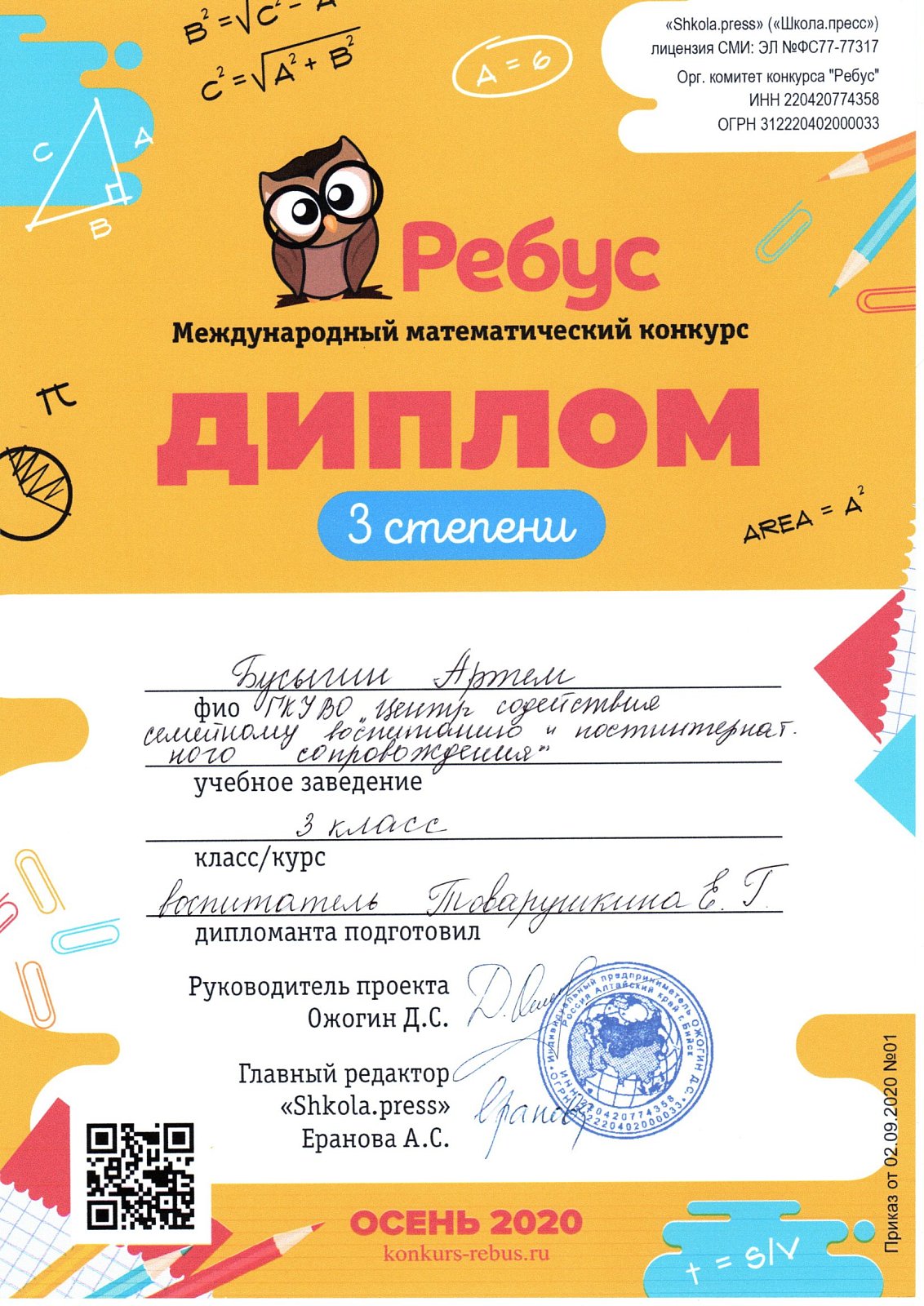 17 воспитанников центра приняли участие в осеннем Международном математическом конкурсе «Ребус».